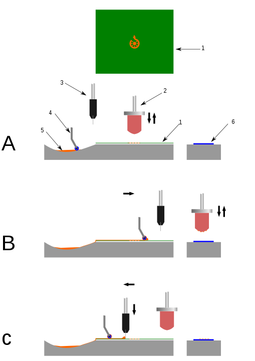 1. 從起始位置開始,密封的墨杯(倒置的盛有墨水的杯子)位于印版蝕刻圖稿區域上方,覆蓋圖像并用墨水填充圖像。